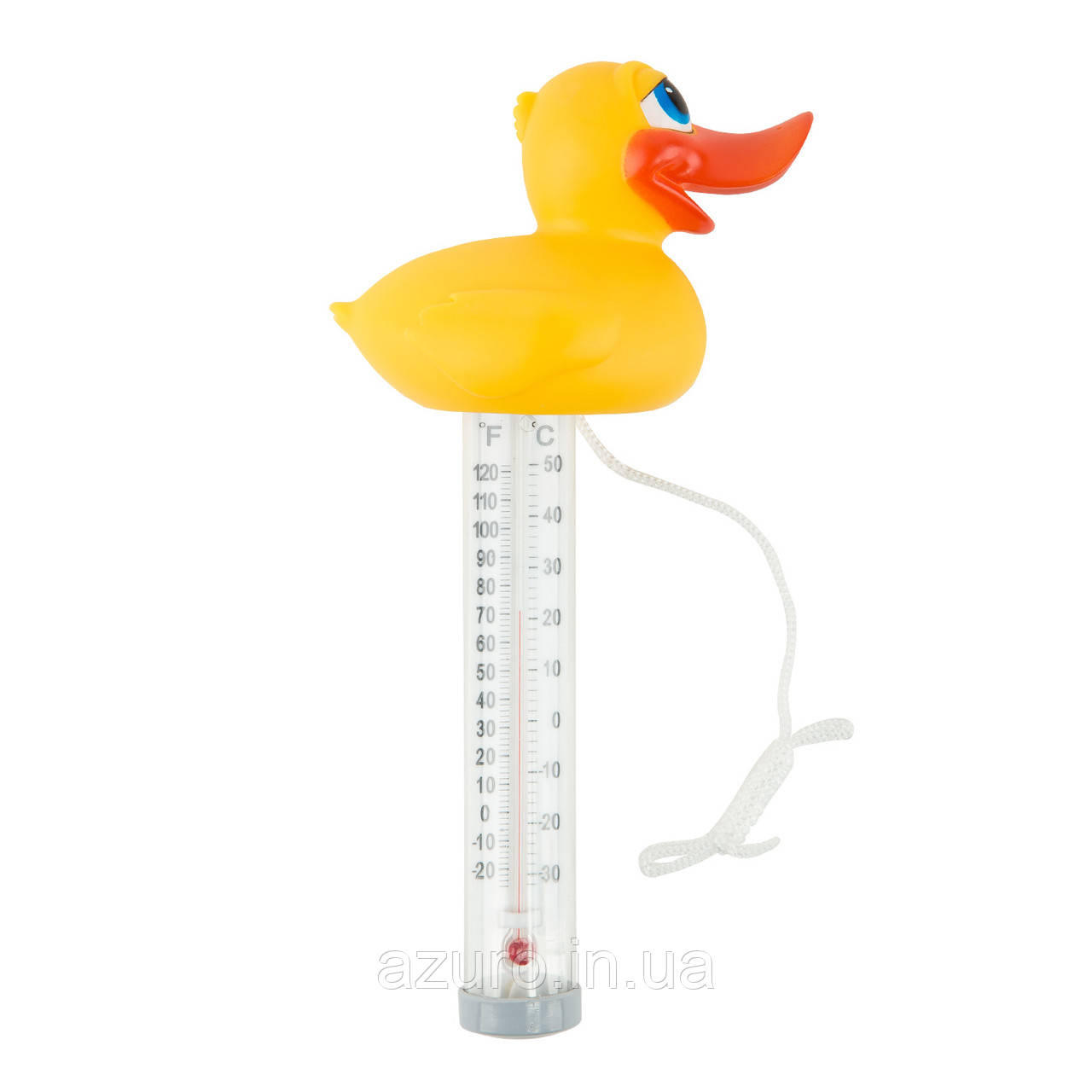 Плаваючий термометр іграшка Kokido K785BU/6P Качка для басейну. Виготовлений з нешкідливого полімеру, не містить скла, ртуті або гострих частин. Має дві шкали - Цельсія і Фаренгейта. Обладнаний плавучим шнурком, який кріпиться до стінки басейну.